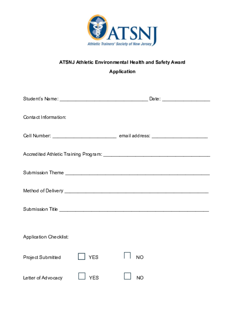 The Athletic Trainers’ Society of New Jersey (ATSNJ) Athletic Environmental Health and Safety (AEHS) Award recognizes an ATSNJ student member enrolled in a New Jersey accredited athletic training program who’s submitted project has the potential to have a positive impact on environmental health and safety in athletics. The award recipient will receive one (1) complimentary registration for the upcoming ATSNJ Annual Conference.